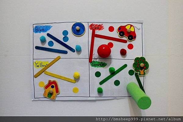 先教孩子將東西黏放到對的顏色區塊,